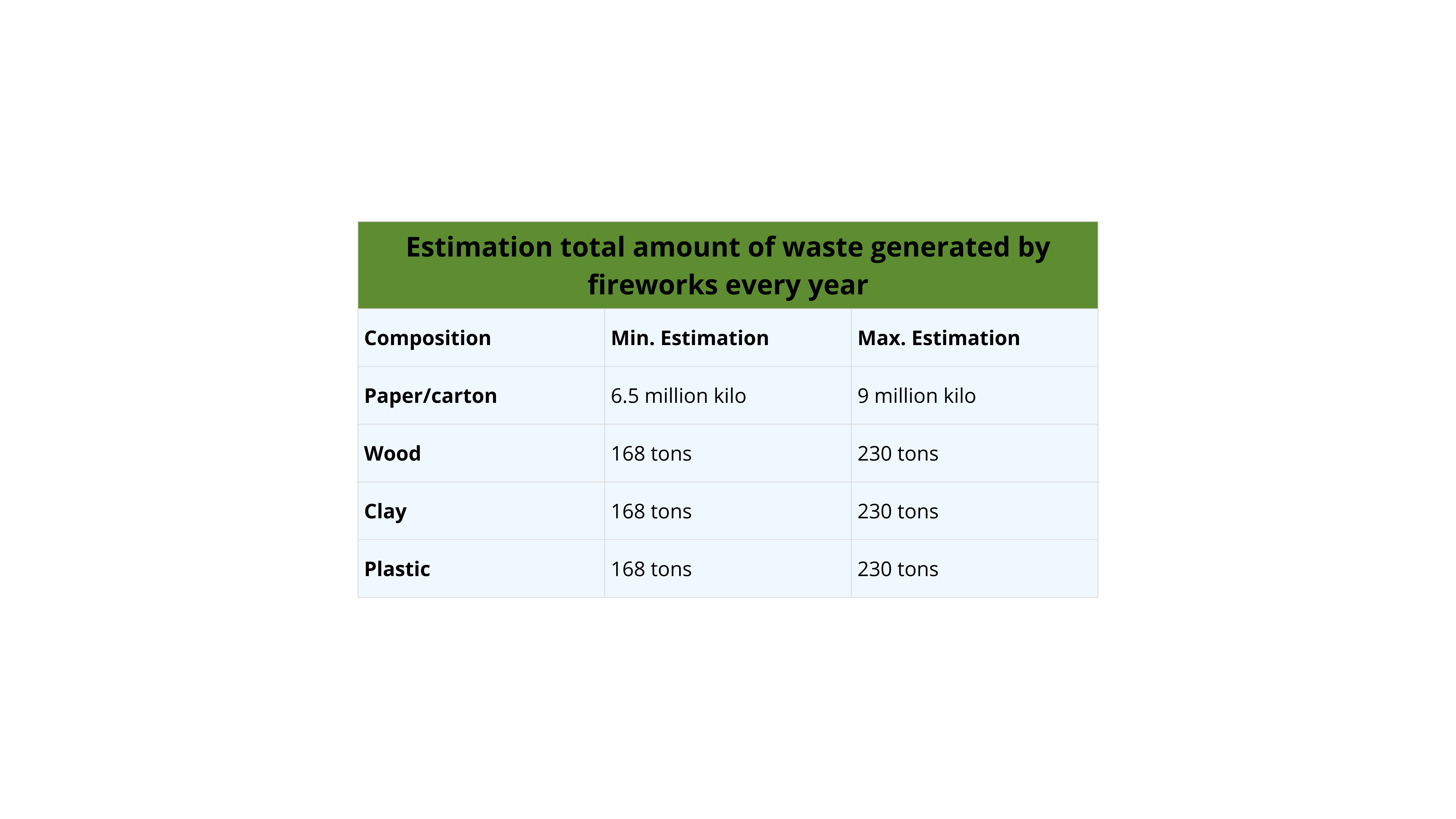 - Firecrackers: Consist almost entirely of paper and leave behind nearly a kilo of waste per kilo of fireworks (900 grams of paper/cardboard).